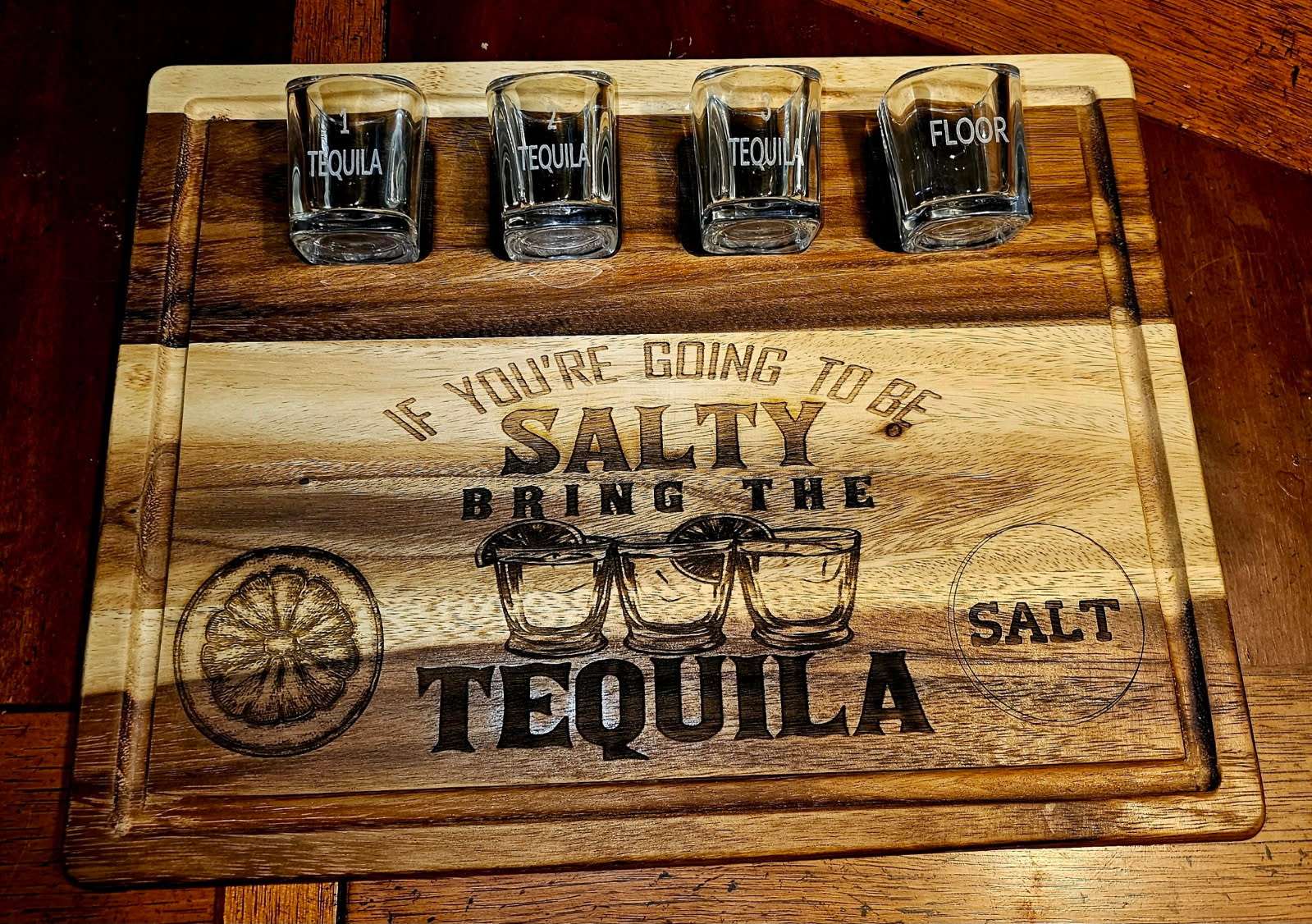 Acacia Wood Tequila Board Set – Customizable with 4 Shot Glasses
